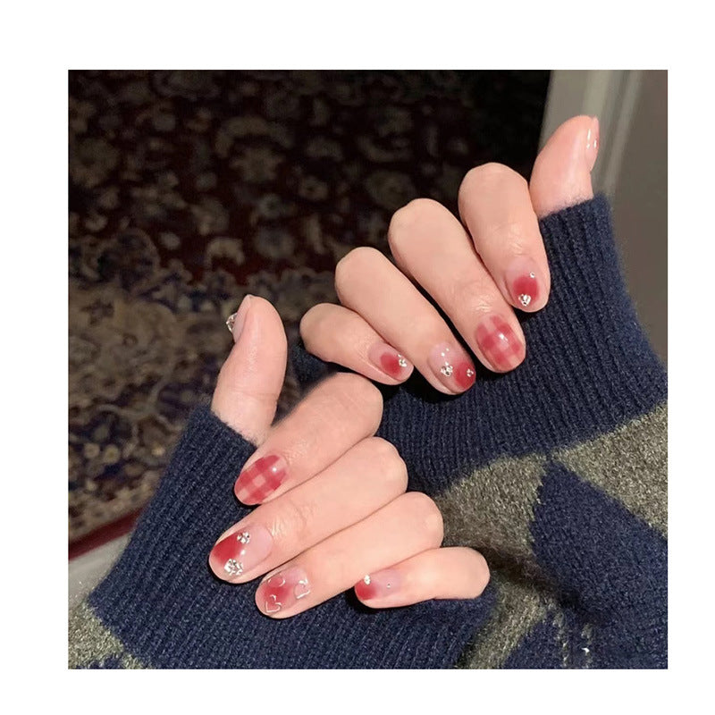 Romantic Charm Short Oval Red Gradient Press On Nail Set with Heart and Gem Accents