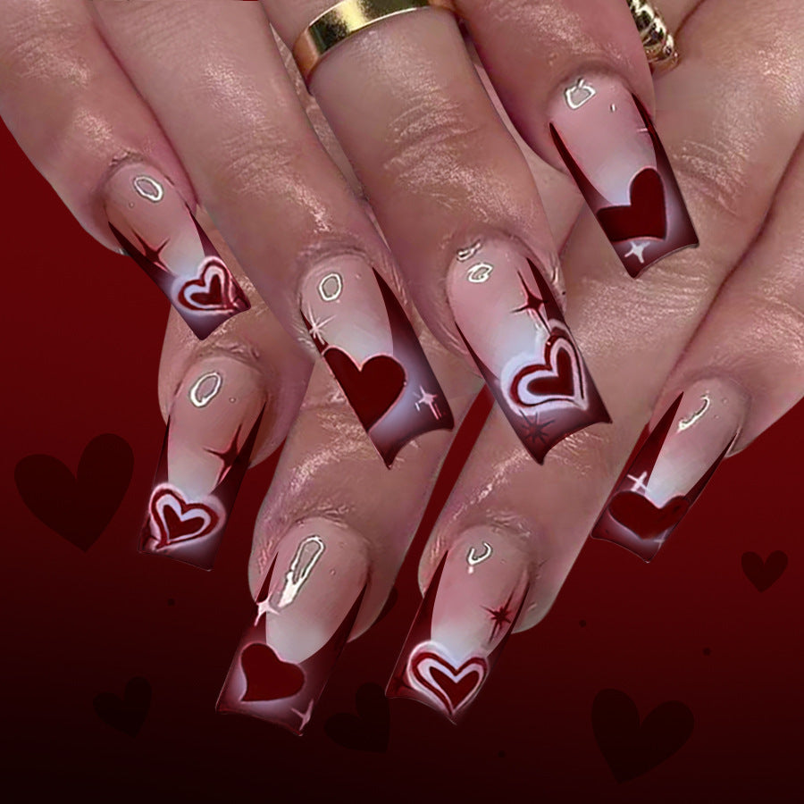 Romantic Elegance Long Square Burgundy and Pink Ombre with Heart Design Press-On Nail Set