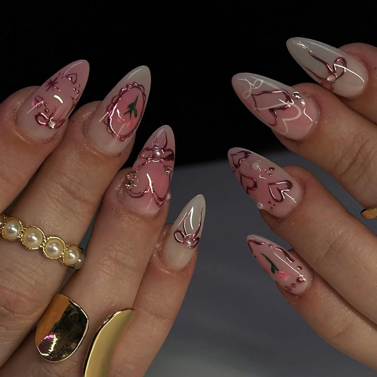 Romantic Garden Medium Almond Pink Nails with Glossy Floral Accents