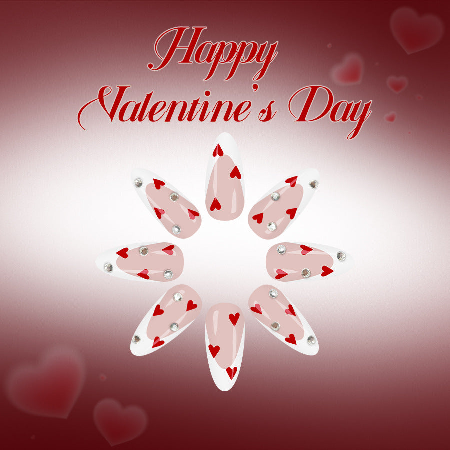 Romantic Heartfelt Long Almond Shaped Red and Pink Press On Nail Set with Glitter Accents