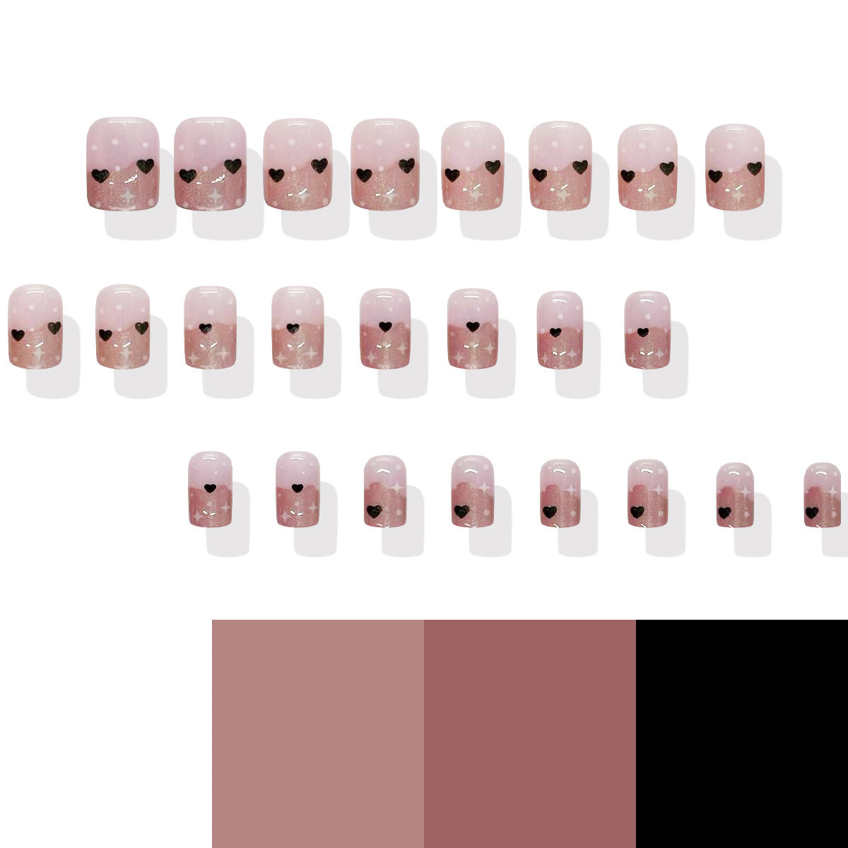 Romantic Hearts Theme Charming Short Square Blush Pink Nails with Black Heart Accents and Shimmering Glitter Finish