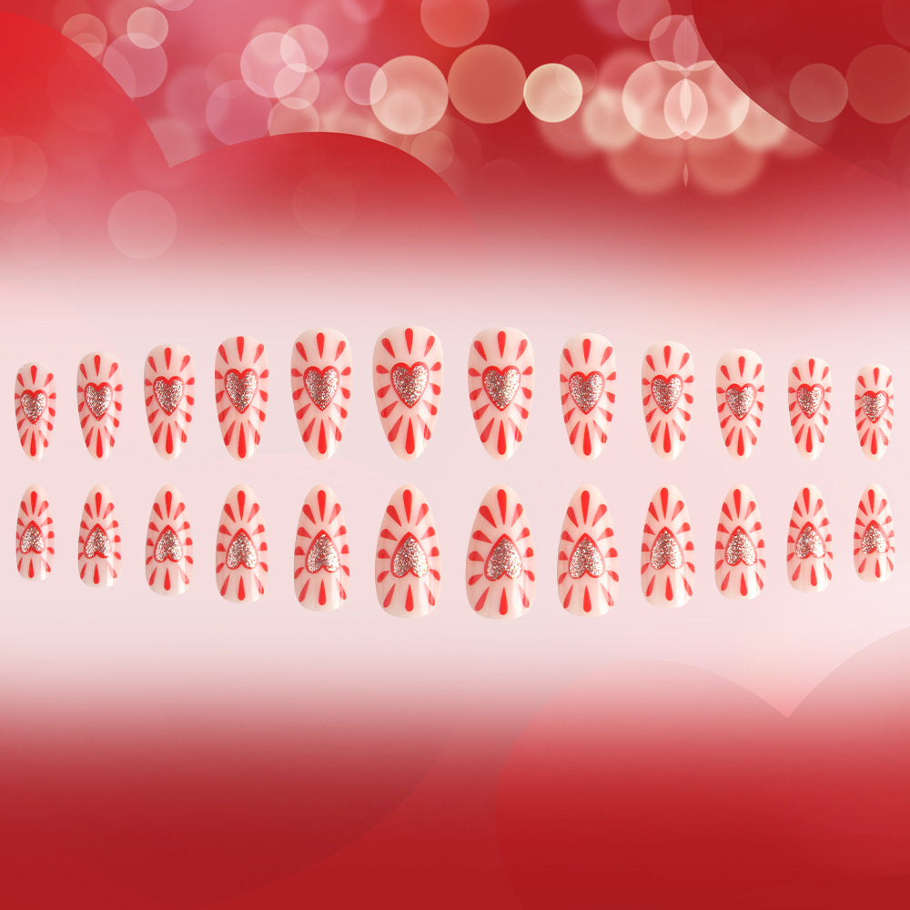 Romantic Love Theme Short Almond Shaped White and Red Heart Design with Sparkling Gems Press On Nail Set
