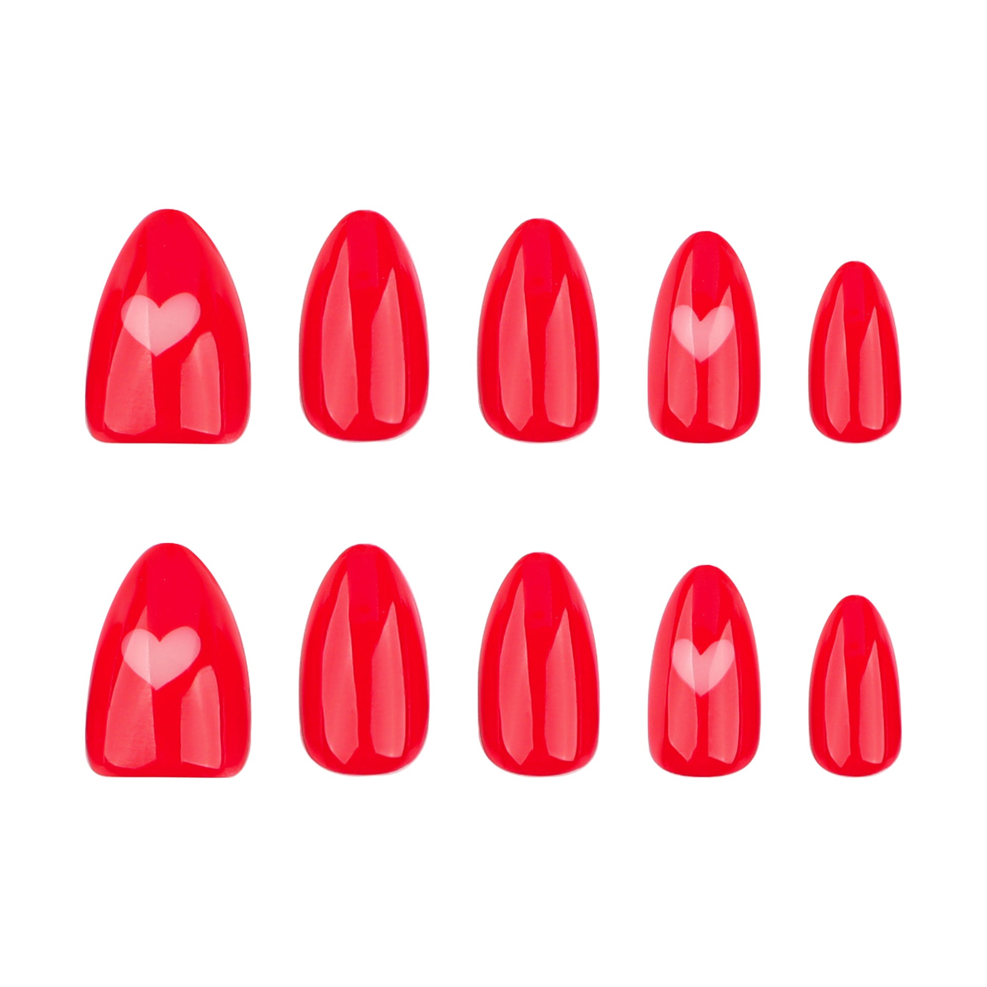 Romantic Radiance Short Almond Pointed Glossy Red Press On Nail Set with Love Heart Detail