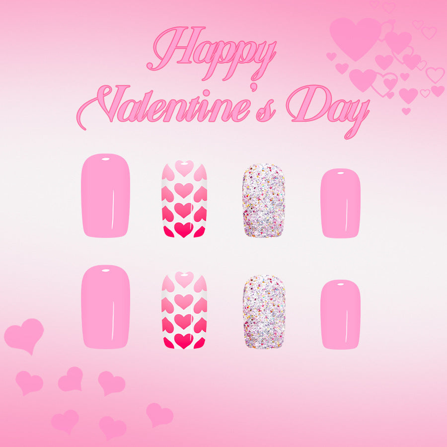 Romantic Valentine Pink Long Square Lovely Hearts Glitter Press-On Nail Set