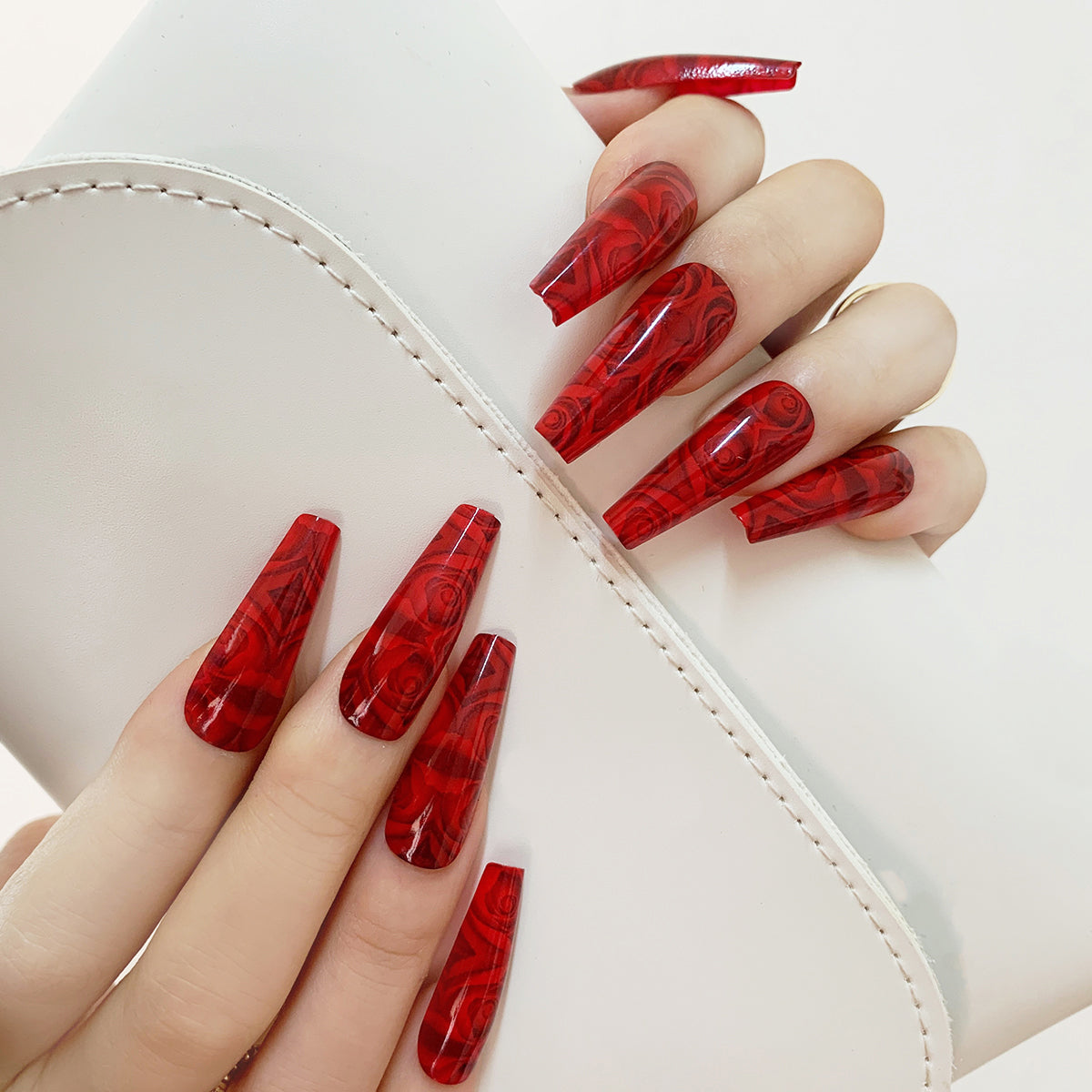 Rose Bouquet Long Coffin Red Valentine's Day Press On Nails