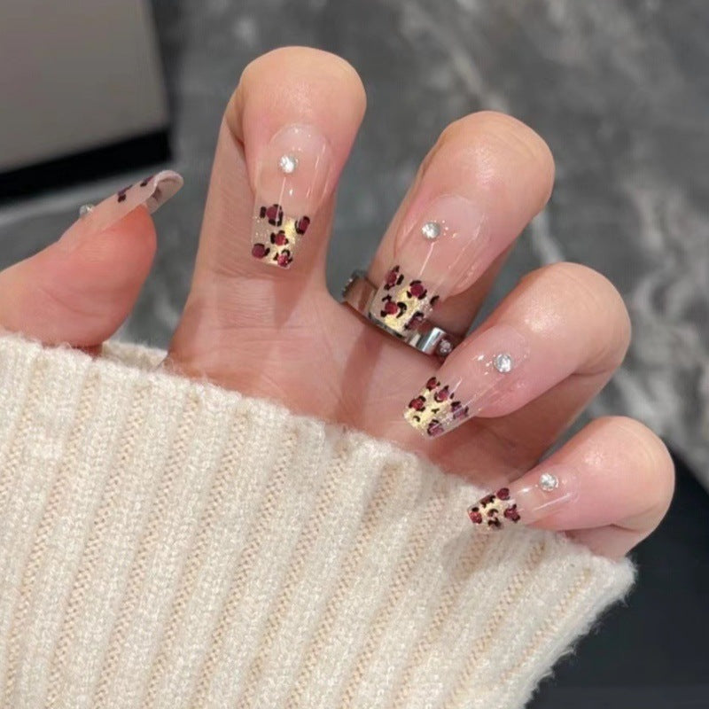 Savannah Chic Medium Coffin Clear with Leopard Print and Sparkling Gems Press on Nail Set