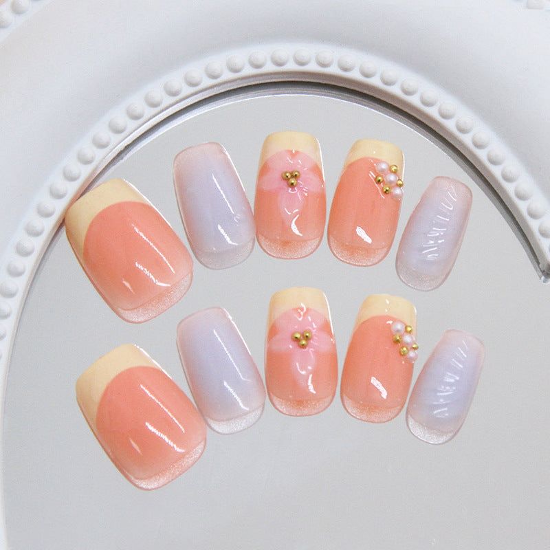 Serene Blossom Medium Square Peach and Lavender Press-On Nail Set with Floral Accents