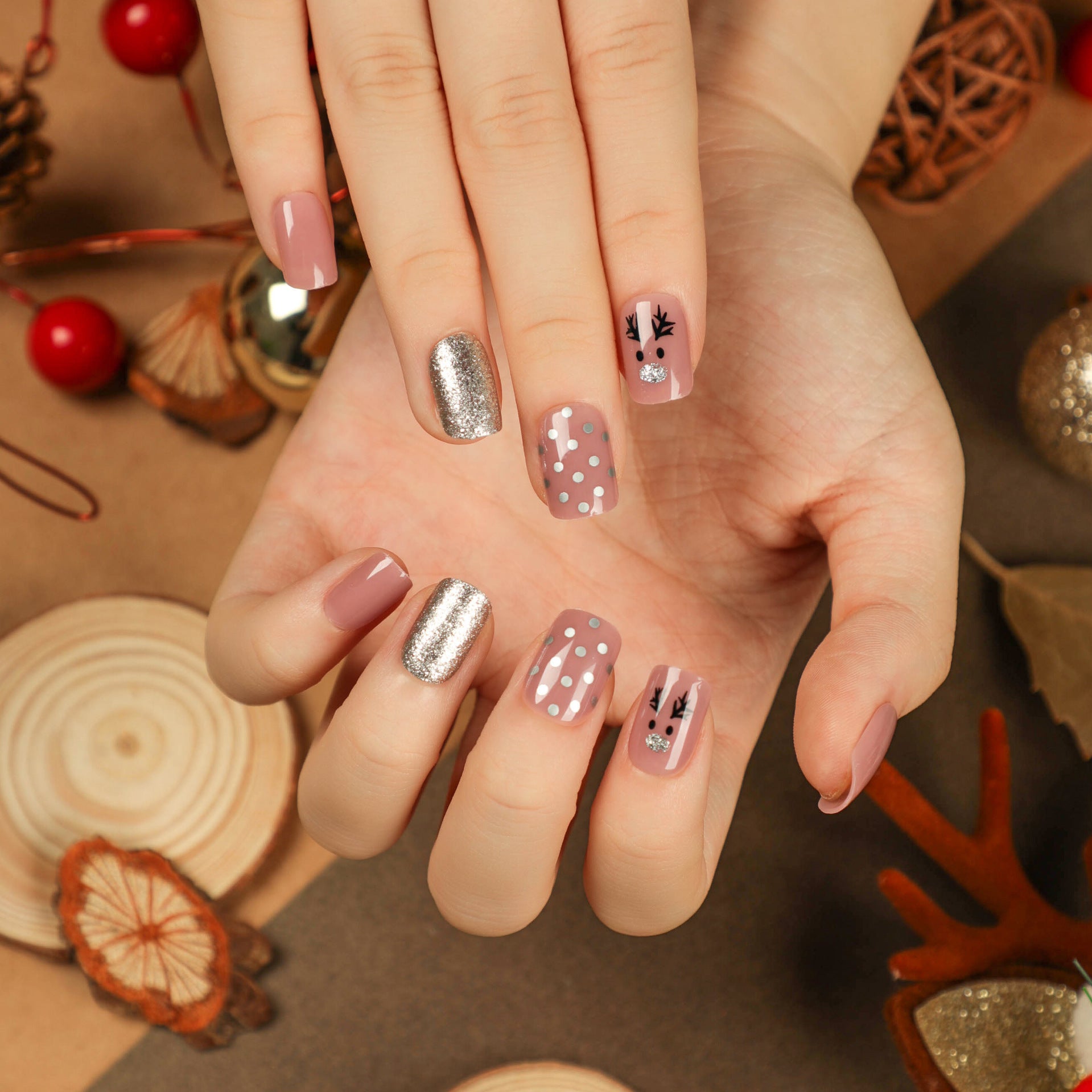 Silver Nosed Reindeer Short Squoval Pink Holiday Press On Nails