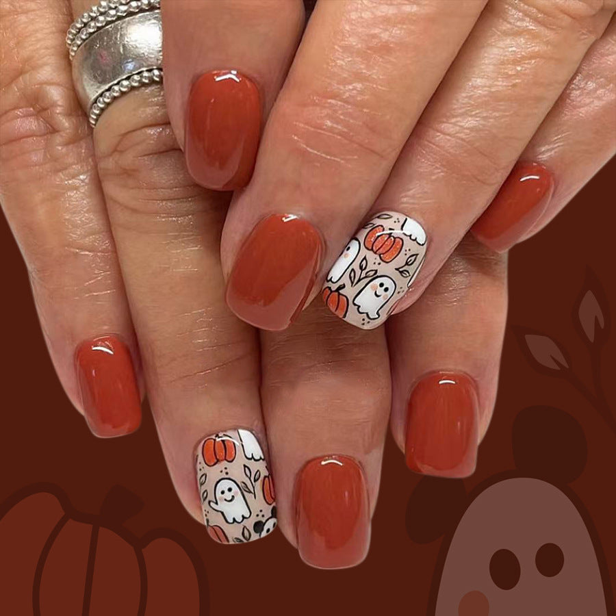 Spooky Autumn Vibes Short Square Burnt Orange with Halloween Ghost and Pumpkin Design Press On Nail Set