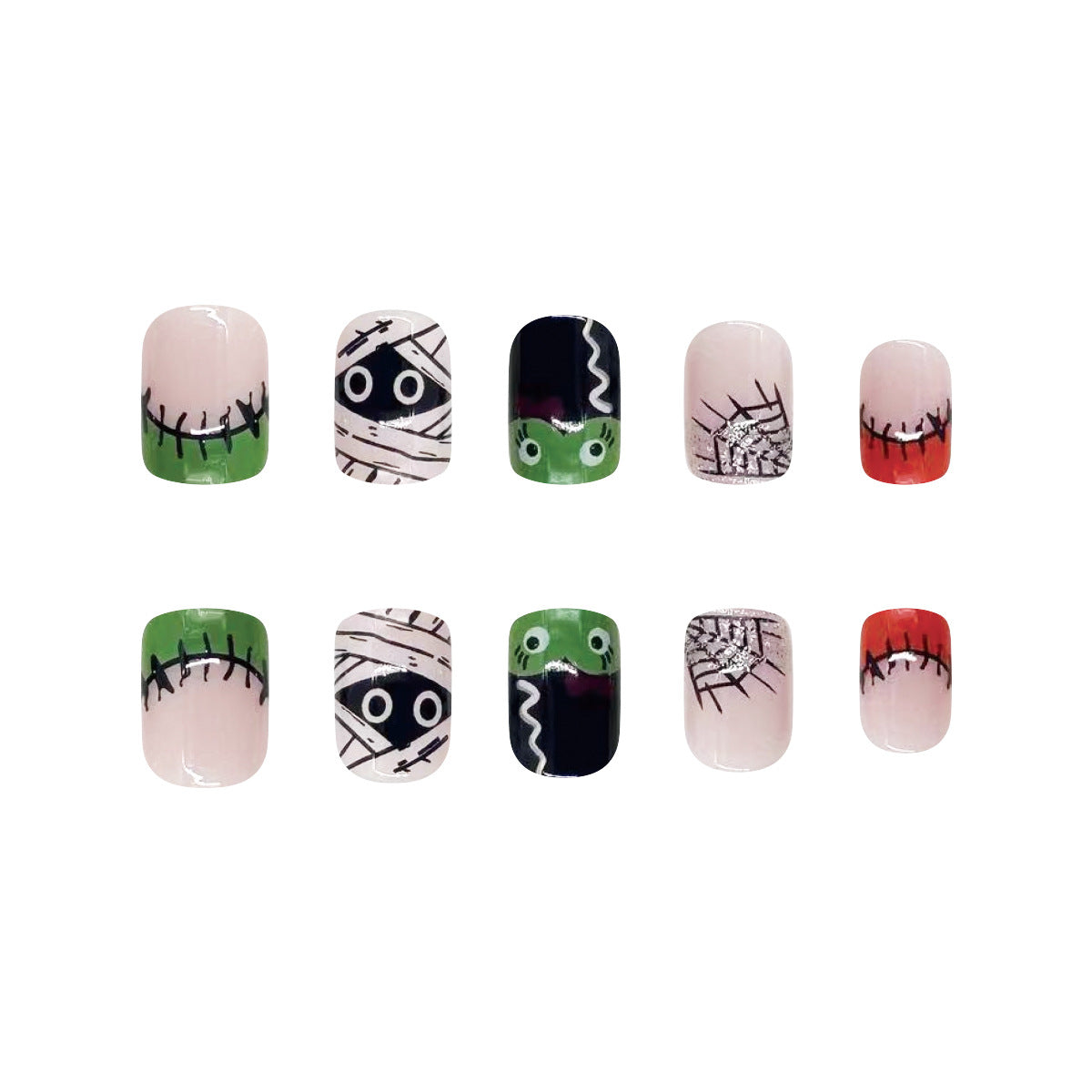Spooky Chic Medium Length Square Press On Nail Set in Black White and Red with Cartoon Monster Designs