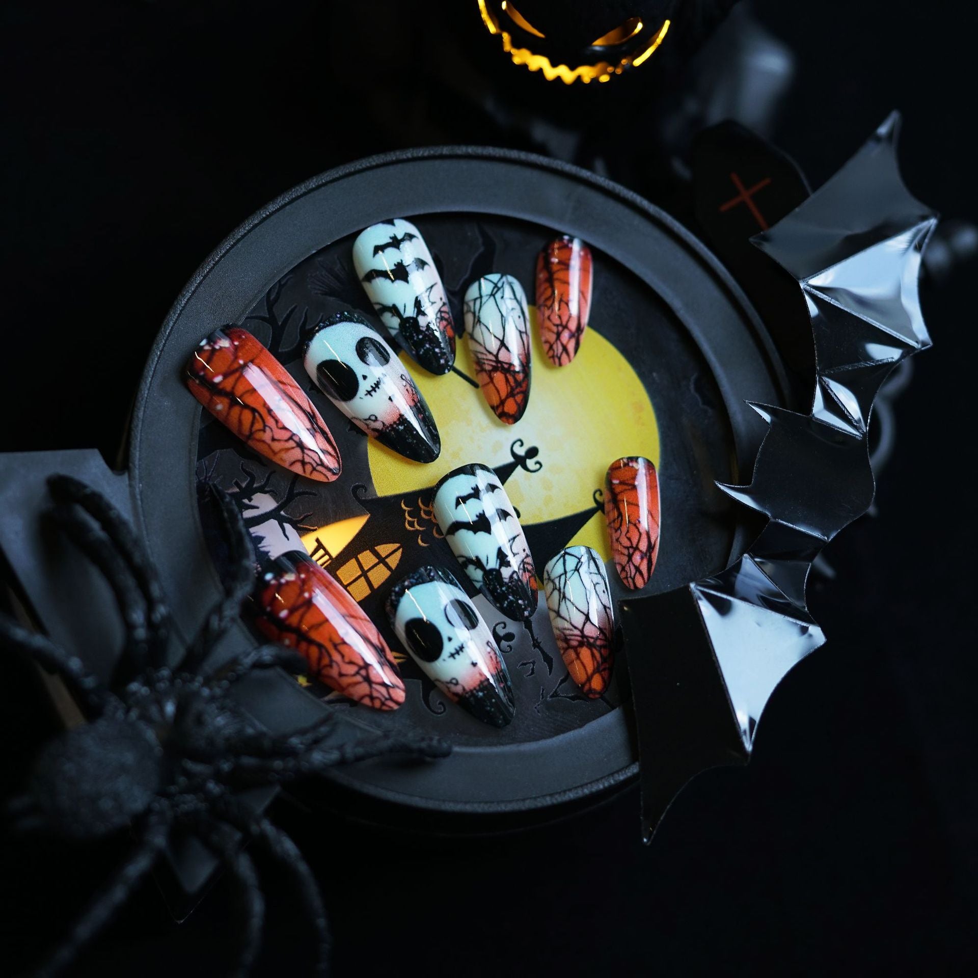 Spooky Halloween Medium Almond Orange and Black Skulls with Spiderweb Design Press On Nail Set