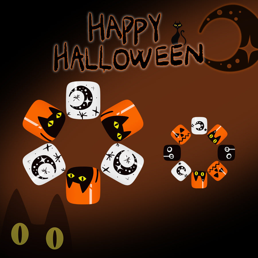 Spooky Halloween Short Square Orange and Black Press On Toenail Set with Fun Cat and Moon Designs
