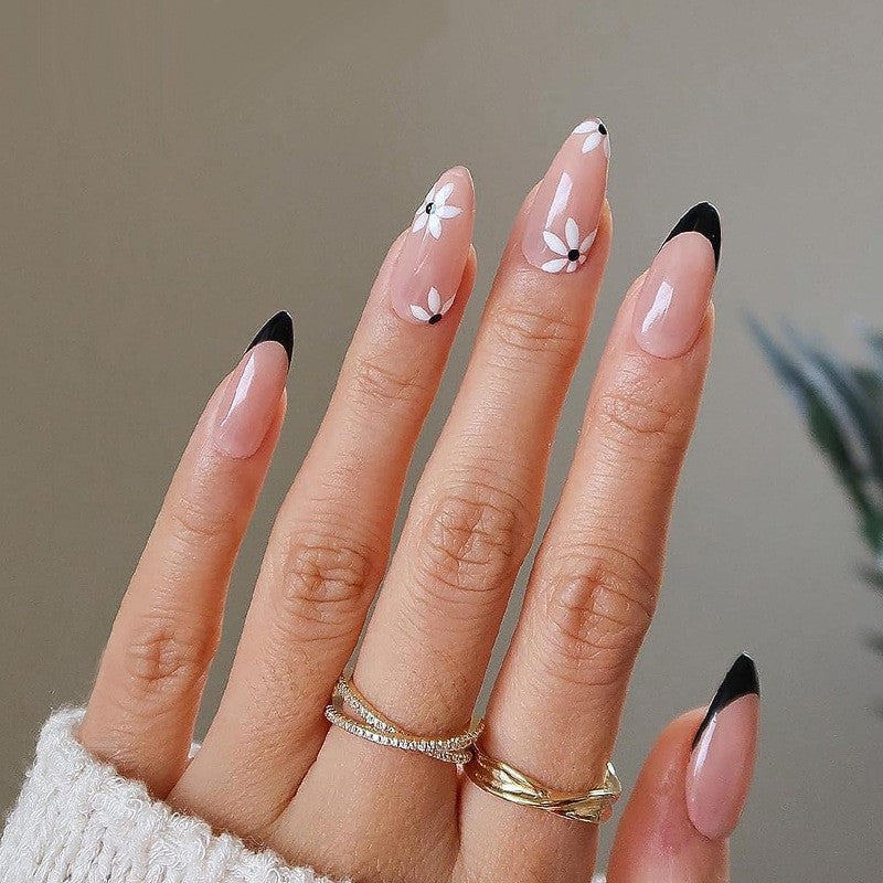Spring Blossom Long Almond-Shaped Press On Nail Set in Beige and Black with Floral Accents