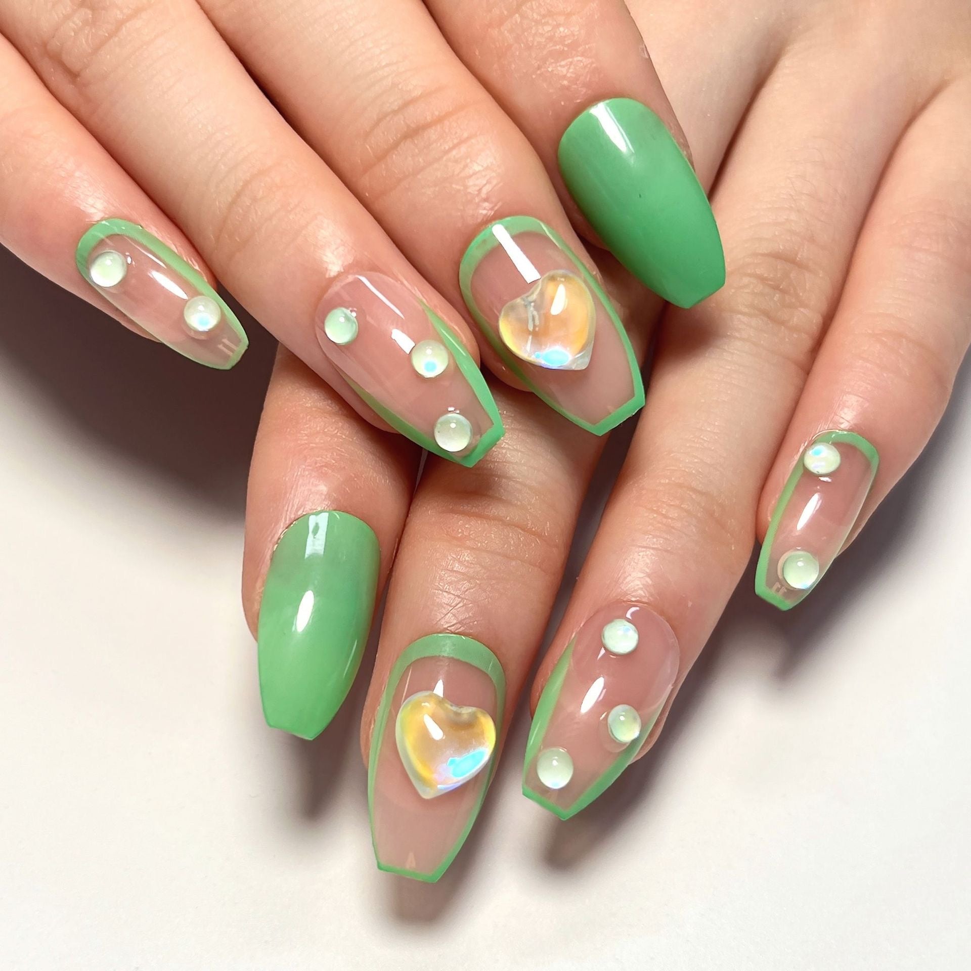 Springtime Medium Coffin Vibrant Green Press-On Nails with Opalescent Accents and Pearl Embellishments