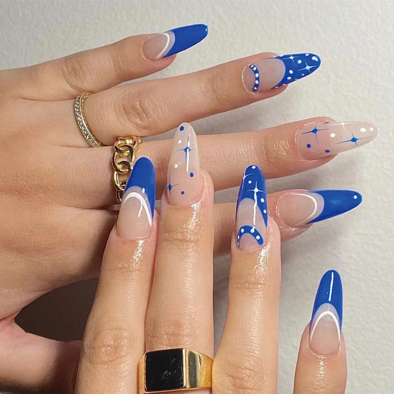 Starry Night Elegance Long Almond Royal Blue and Beige Press On Nail Set with Crescent Moon and Star Accents