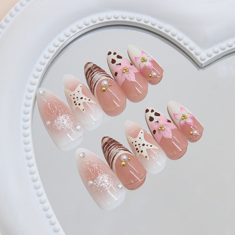 Sweet Treats Elegant Long Almond Shaped Blush Pink Press on Nail Set with Charming Starfish and Bow Accents