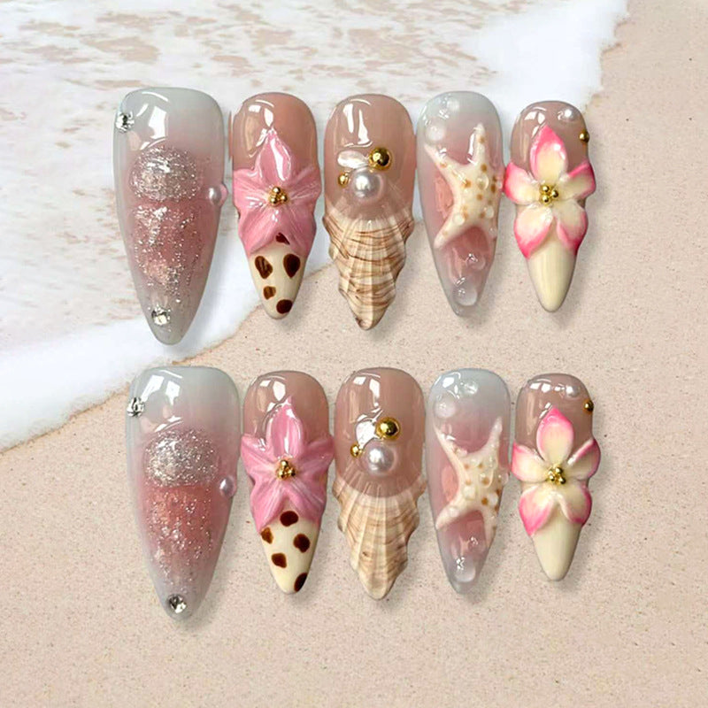 Tropical Bliss Long Almond Blush Pink Shell Inspired Press On Nail Set with Floral Accents