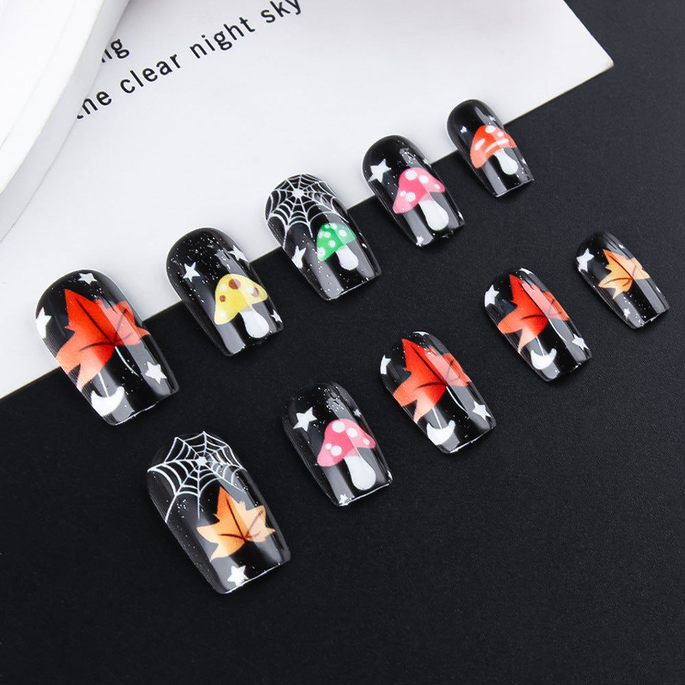 Whimsical Autumn Fantasy Medium Square Black with Colorful Leaves and Enchanting Mushroom Design Press On Nail Set
