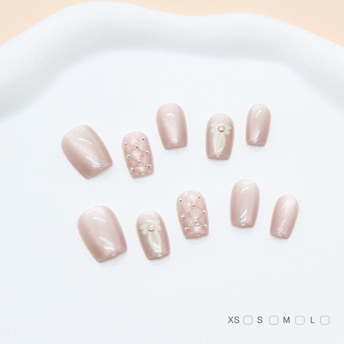 Whimsical Blossom Perfect Length Short Square Beige Floral Accent Press-On Nail Set