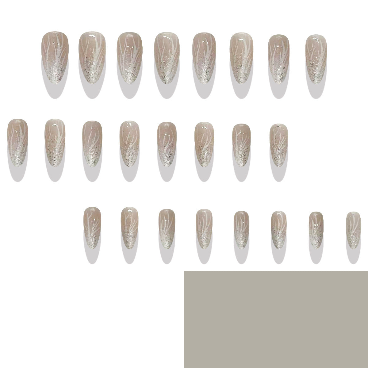 Whimsical Elegance Long Almond Taupe Press On Nails with Sparkling Leaf Design