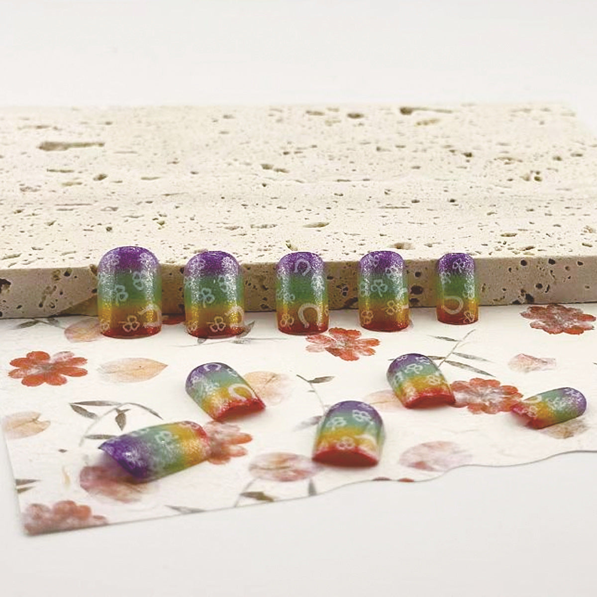 Whimsical Floral Harmony Short Squoval Gel Nails in Vibrant Rainbow with Unique Design Elements