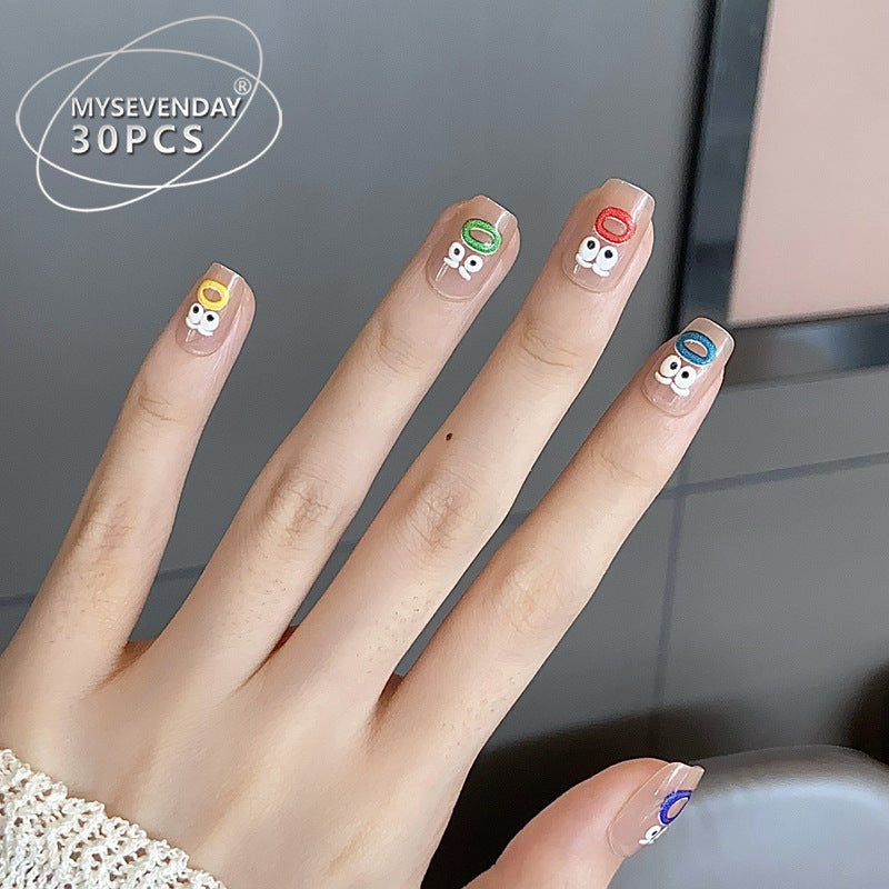 Whimsical Fun Short Square Clear Press On Nail Set with Colorful Cartoon Faces