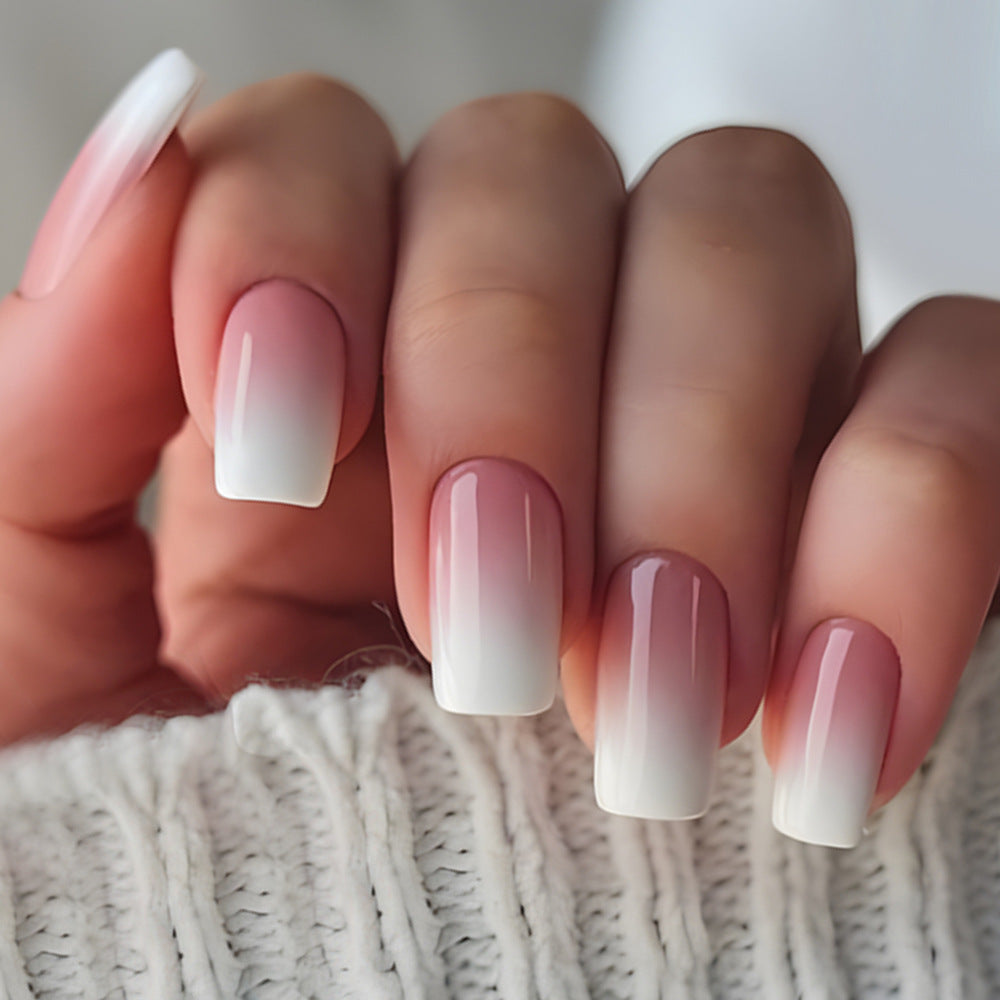 Whimsical Ombre Medium Square Pink to White Gradient Press On Nail Set with Glossy Finish