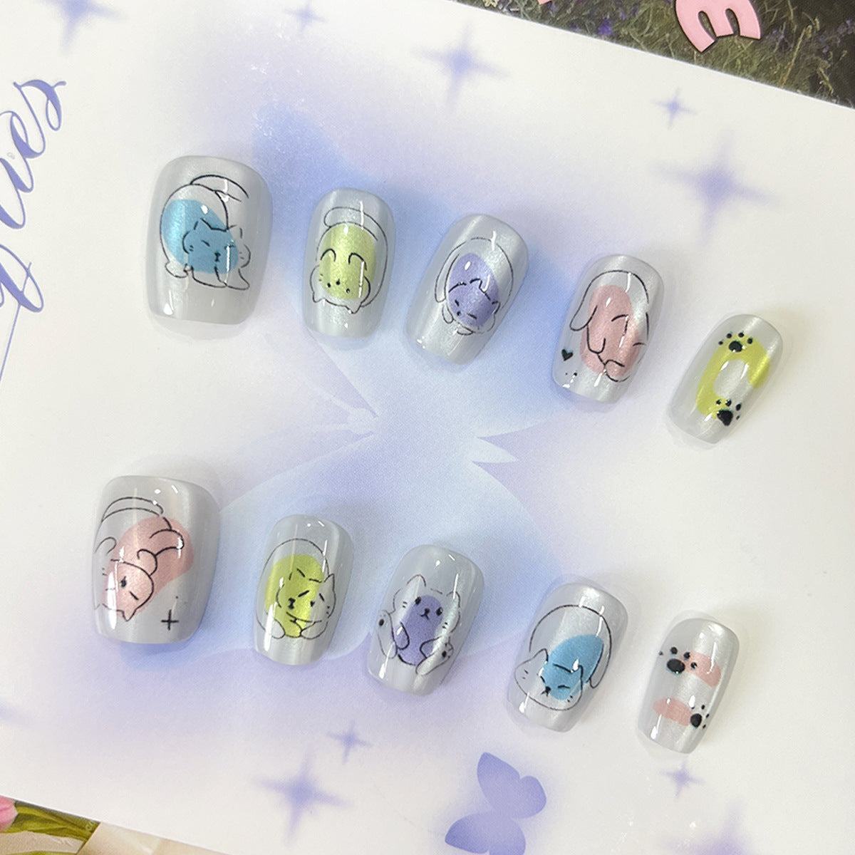 Whimsical Pastel Short Square Press-On Nail Set with Cartoon Animal Designs