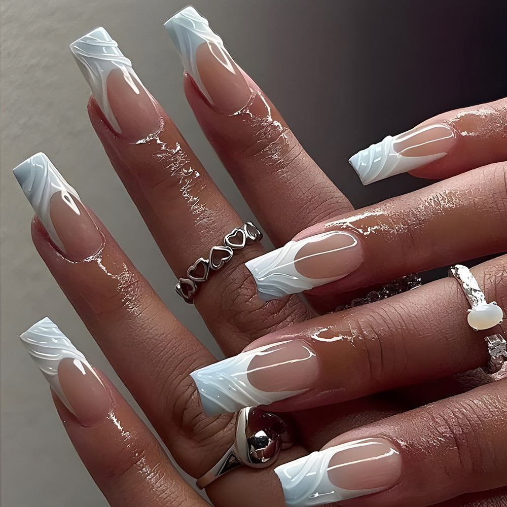 Winter Wonderland Long Square Press On Nail Set in Icy Blue with Elegant Marbled Design