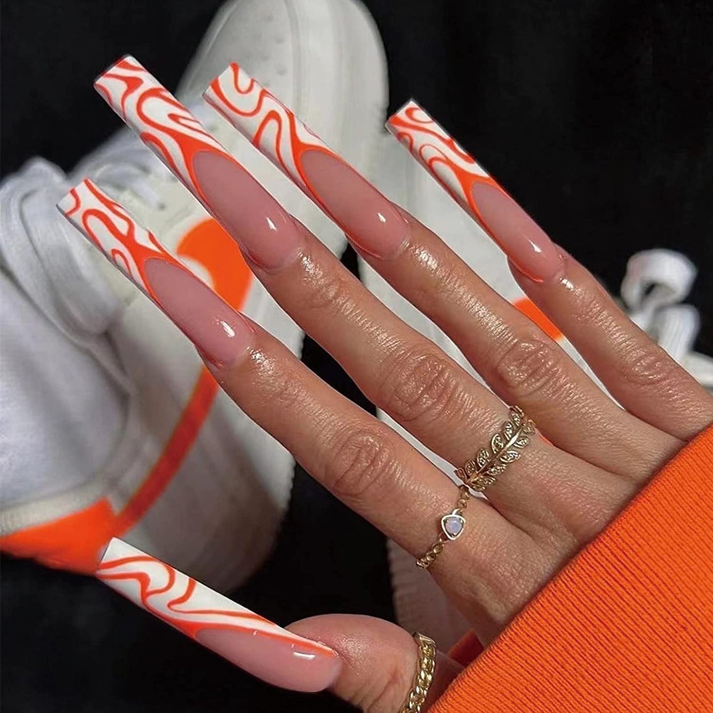 White Swirl Lines Medium Coffin White Everyday Press On Nails